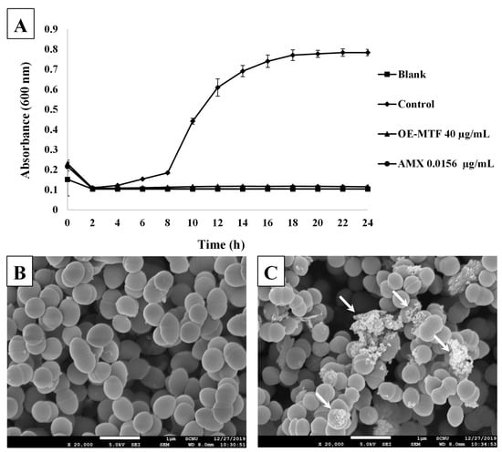Time-growth curve of S. iniae at an MIC of 40 µg/mL (A) and scanning electron microscope (SEM) observation of S. iniae (B,C). Morphology of untreated bacteria (B, ×20,000) and bacteria treated with OE-MTF at 40 µg/mL for 20 h (C, ×20,000). White arrows indicate destruction of bacterial cells with lysed and indistinguishable cytoplasmic membrane structures.