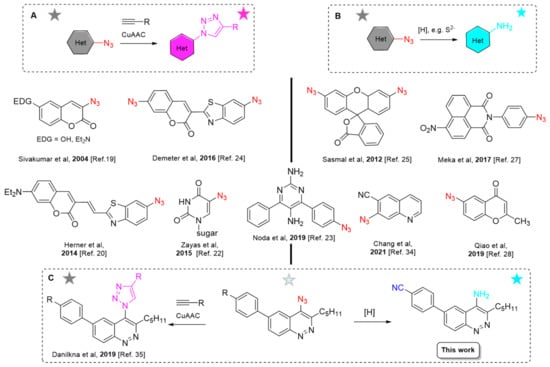 In most cases, fluorogenic organic azides possess an azide group attached either to an aromatic or to a heterocyclic ring. Thus, in (hetero)aromatic azides, the chemical transformations of the azido-group induce a reorganization of the whole conjugated electronic system that leads to the desired fluorogenic properties of the molecule. Several selected recent examples of fluorogenic azides of both types are represented in Figure 1A,B.