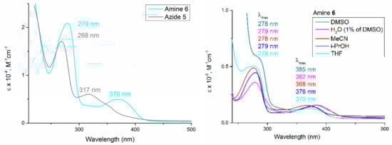 Absorption spectra of the solutions of azide 5 and amine 6 in THF (c = 1 × 10−4 mol/L) (left); absorption spectra of the amine 6 solutions in DMSO, H2O, MeCN, i-PrOH and THF, (c = 1 × 10−5 mol/L) (right).