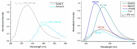 Emission spectra of solutions of azide 5 and amine 6 in THF, c = 1 × 10−5 mol/L (left); emission spectra of the solutions of amine 6 in different solvents, c = 1 × 10−5 mol/L (right).