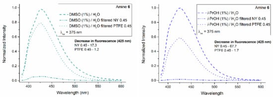 Emission spectra of solutions of amine 6 in DMSO (1%)/H2O, c = 1 × 10−5 mol/L (left) and in i-PrOH (1%)/H2O, c = 1 × 10−5 mol/L (right) before and after the filtration through nylon and PTFE membrane filters.