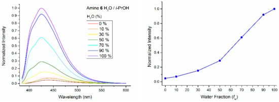 Then the emission spectra for the solutions of amine 6 in i-PrOH-H2O mixtures with different water fraction (fw) (in vol%) were measured. The obtained data illustrate the direct gradual dependence of fluorescence intensity on the water fraction (Figure 6, left). It is important to note, that typical AIE curves reveal faint emission at water fractions below a definite meaning, and progressively increasing emission as water fraction exceeds this value [42]. Therefore, the gradual increase in fluorescent intensity in the case of amine 6 (Figure 6, right) can be considered as the additional evidence for the cooperation between AIE and ESPT mechanisms. Moreover, the absence of fluorescence of amine 6 in solid state also proves that AIE is not the only reason for the induced fluorescence in water [42].