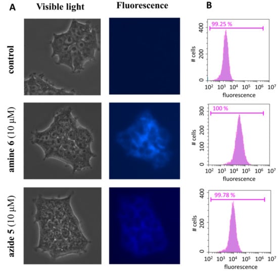 Two separate cell probes were treated with amine 6 and azide 5 (c = 10 μM), respectively, and incubated for 4 h at 37 °C. Then, both probes were analyzed by fluorescent microscopy and flow cytometry. The obtained data revealed that amine 6 can enter HepG2 cells, and it accumulates in different cell organelles that can be detected by fluorescent microscopy using standard 4′,6-diamidino-2-phenylindole (DAPI) light cube (357/44 nm excitation; 447/60 nm emission) (Figure 7A) and by flow cytometry (Figure 7B). Fluorescence microscopic images of cell monolayers (Figure 7A) show fluorescent cells with non-fluorescent cell nuclei, suggesting that amine 6 enters cells but does not accumulate in the cell membrane and cell nuclei.
