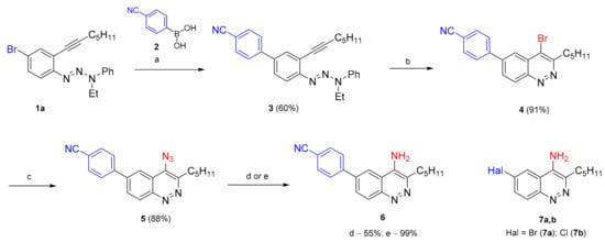 4-(4-Bromo-3-pentylcinnolin-6-yl)benzonitrile (4): Cinnoline 4 was synthesized in accordance with the general procedure for the Richter-type cyclization from triazene 3 (335 mg, 0.880 mmol, 1.00 equiv). The crude product—a yellow solid (279 mg, 92%) was filtered off, washed with water, dried and used in the next step without purification. The sample for the m. p. determination was recrystallized from acetonitrile. m.p. 135−137 °C. The spectral data correspond to the data reported earlier [35]. 1H NMR (400 MHz, acetone-d6) δ = 8.60 (d, J = 8.8 Hz, 1H), 8.44–8.40 (m, 1H), 8.32 (dd, J = 8.8 Hz, 1.9 Hz, 1H), 8.15–8.10 (m, 2H), 8.02–7.97 (m, 2H), 3.45–3.38 (m, 2H), 1.98–1.87 (m, 2H), 1.54–1.34 (m, 4H), 0.93 (t, J = 7.0 Hz, 3H).