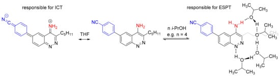 Thus, ESPT with the formation of quinoid-type emissive excited states was studied for different heterocyclic systems [37,38,39,40] and a competition between ICT and ESPT for heterocyclic D-π-A molecular architecture has been reported recently [41].