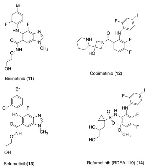 Selumetinib (13) (6-(4-bromo-2-chloroanilino)-7-fluoro-N-(2-hydroxyethoxy)-3-methylbenzimidazole-5-carboxamide) is the chloro analogue of 11. A combination of 5-FU and an MEK inhibitor in sequence has shown synergistic effects in KRAS or BRAF mutant colon cancer models, compared to monotherapy. Moreover, the administration of 5-FU followed by 13 showed superior synergy compared with the reverse or concomitant treatment in six cell lines [90].