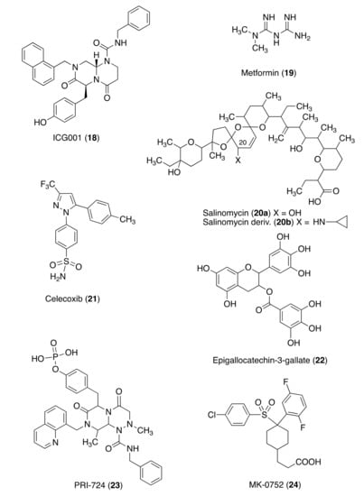 PRI-724 (23) is an antagonist of the interaction between β-catenin and its transcriptional coactivator CREB-binding protein. In preclinical studies, 23 promotes differentiation of chemotherapy-insensitive cancer stem cells and tumor-initiating cells, inhibits stroma formation, and decreases metastatic potential [165,166].