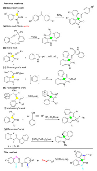 Spirooxindoles are ubiquitous in bioactive natural products and have found extensive applications in drug discovery [1,2,3,4,5,6,7]. On the other hand, spiroindenes have also gained considerable interest in medicinal chemistry [8,9,10,11,12,13]. The investigation of biological and pharmaceutical properties of spiroindenyl-2-oxindoles that contain both spiro-bridged indene and oxindole moieties is highly intriguing [14,15]. To achieve this, it is essential to develop efficient synthetic methods for the analysis of compounds of such a type. Currently, the reactions for the synthesis of spiroindenyl-2-oxindoles are rare, and the majority of them rely on the use of 3-substituted indoles as the starting materials (Figure 1a–f) [14,15,16,17,18,19]. It should be noted that Desrosiers and coworkers reported an elegant synthetic approach for spiroindenyl-2-oxindoles through nickel-catalyzed intramolecular Heck cyclization (Figure 1g) [20,21].