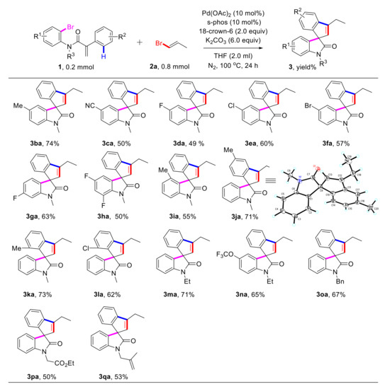 Next, the reactions of acrylamide bearing different N-substituents were probed. A range of N-substituents, including the ethyl, benzyl 2-ethoxy-2-oxoethyl and 2-methylallyl group, were compatible, and a variety of spiroindenyl-2-oxindole derivatives were afforded (3ma–3qa). Finally, it should be noted that the substrate containing an ether linkage could also form the desired spirocyclic product 3ra (Scheme 2).