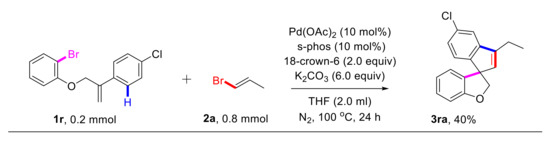 The reactions were carried out in a Schlenk tube in the presence of 1r (0.2 mmol), 2a (0.8 mmol), Pd(OAc)2 (10 mol%), s-phos (10 mol%), 18-crown-6 (2.0 equiv), K2CO3 (6.0 equiv), and THF (2.0 mL) at 100 °C for 24 h under N2.