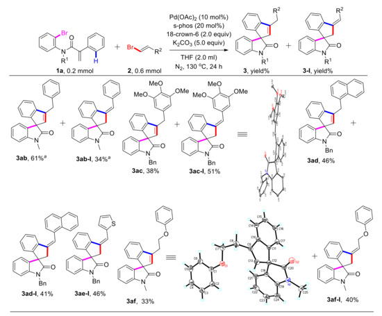 The vinyl bromide scope was then explored (Scheme 3). When styryl bromide was allowed to react with 1a under the slightly modified standard conditions, spiroindenyl-2-oxindole 3ab and compound 3ab-I were obtained. The formation of 3ab-I should be due to the stabilization of the exocyclic double bond by the phenyl group. As expected, styryl bromide derivatives, such as trimethoxystyryl bromide and (E)-1-(2-bromovinyl)naphthalene, also gave two isomers (3ac and 3ac-I). The structure of 3ac-I was confirmed by single-crystal X-ray crystallography. It should be noted that the trimethoxyphenyl group was on the same side as the benzene ring, and the double bond in compound 3ac-I had Z-configuration. This structure provides crucial evidence regarding the mechanism of the reaction. (E)-2-(2-bromovinyl)thiophene was also reactive, and only the exocyclic double bond product (3ae-I) was obtained. Intriguingly, two products (3af and 3af-I) were also obtained in the reaction of alkylvinyl bromide 2f. The structure of 3af was also confirmed by single-crystal X-ray crystallography.