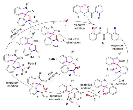- Liu, J.-G.; Chen, W.-W.; Gu, C.-X.; Xu, B.; Xu, M.-H. Access to Spiroindolines and Spirodihydrobenzofurans via Pd-Catalyzed Domino Heck Spiroyclization through C–H Activation and Carbene Insertion. Org. Lett. 2018, 20, 2728–2732. [Google Scholar] [CrossRef] [PubMed]