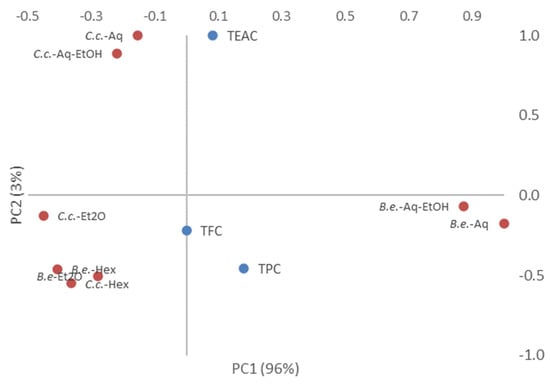 PCA biplot of mushroom extracts based on their TPC, TFC, and TEAC. B.e.-Boletus edulis; C.c.-Cantharellus cibarius; Aq-aqueous extract; Aq-EtOH-hydro-alcoholic extract; Hex-hexanic extract; Et2O-etheric extract; TPC-total phenolic content; TFC-total flavonoid content; TEAC-Trolox equivalent antioxidant capacity.