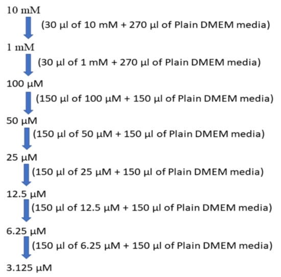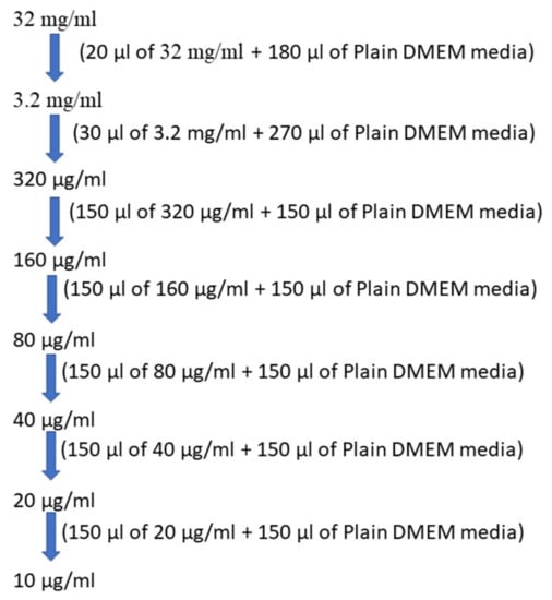 For cytotoxicity studies, 32 mg/mL stock solution was prepared using DMSO for BD. Then, the serial two-fold dilutions were prepared from 320 to 10 µg/mL using DMEM plain media for treatment. The preparation of the different sample concentrations 10, 20, 40, and 80 µg/mL is depicted in Figure 2.