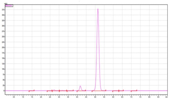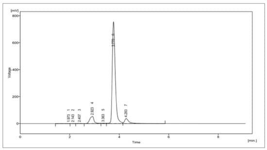 The HPLC analysis of curcuminoids showed three major peaks, expressing the presence of three compounds, namely, bisdemethoxycurcumin, curcumin, and demethoxycurcumin at Rt values of 2.923, 3.770 and 4.283 min. The area percentage enclosed by these peaks were 8.6%, 84.0% and 6.3%. Hence, this HPLC in Figure 3 further confirms that the isolated curcuminoids were found to be a mixture of only three major compounds. The details of this HPLC analysis are expressed in Table S1 of the Supplementary Materials.