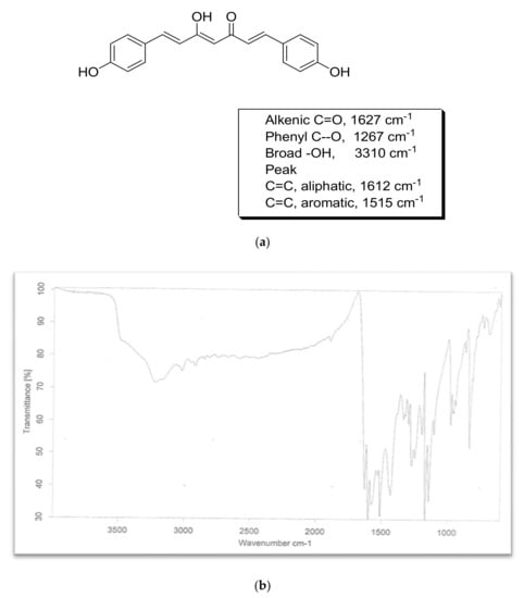 FTIR of bisdemethoxycurcumin. (a) Structure & chracteristic peaks of bisdemethoxycurcumin; (b) FTIR spectra of bisdemethoxycurcumin.