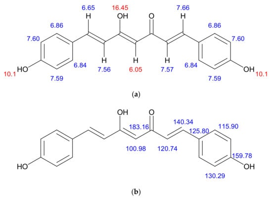 (a) structural characterisation of protons in the bisdemethoxycurcumin. 1H NMR (d6–DMSO, 400 MHz, δ, TMS = 0): 16.45 (1H, s, –OH), 10.10 (2H, s, Ar-OH), 7.57–7.60 (6H, m, ArH, –CH–), 6.69–6.86 (6H, m, ArH, –CH–), 6.05(1H, s, –C–H); (b) structural characterisation of carbons in the bisdemethoxycurcumin. 13C NMR (d6– DMSO, 400 MHz, δ, TMS = 0): 100.98, 115.90, 120.74, 125.80, 130.29, 140.34, 159.78, 183.16.