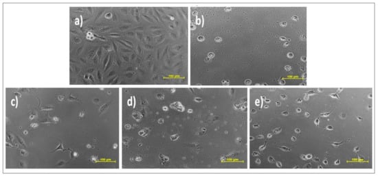 Effect of different samples on the Vero cell line. Samples: (a) DMSO; (b) doxorubicin (Dox); (c) ethanolic extract (EC1); (d) curcuminoid (C3); (e) bisdemethoxycurcumin (BD).