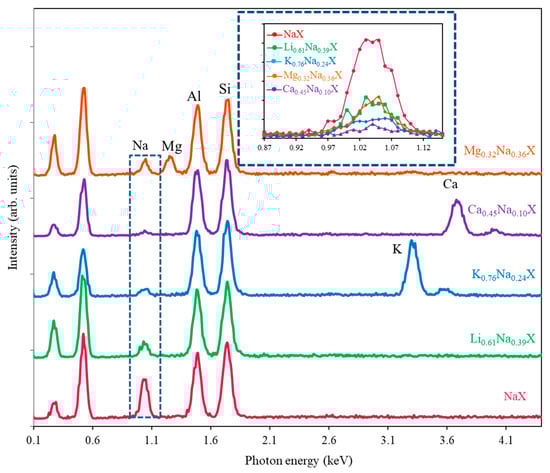 The sodium signals are presented in the inset in Figure 1. Notice that lithium gives no EDS signal. The zeolite composition of anions does not change during the cation exchange process. Normalization with respect to the silicon signal solves the problem of the electron beam current change during the measurements. After normalization, one can compare the intensity of sodium signals in samples (Figure 1 inset). The intensity of the initial sample (NaX) may be assumed as 100%, and thus, the remaining sodium in the other samples may be evaluated. The introduced ions replace the sodium ions with preservation of charge, e.g., one magnesium ion replaces two sodium ions. One should underline that monitoring of depletion of sodium ions enables the measurement of lithium ions, which are not detectable via the EDS method. The quantitative measurement of zeolite ion exchange with EDS is far easier compared to ICP because the samples do not have to be dissolved in fluoric acid. The EDS results were compared with the ones obtained with ICP method, which is commonly considered as very reliable. Moreover, the XRF analysis was also applied with the same internal standard approach, as it was in the case of EDS. The XRF method has few advantages over ICP and EDS, e.g., it is inexpensive, does not require vacuum conditions and does not destroy the sample.