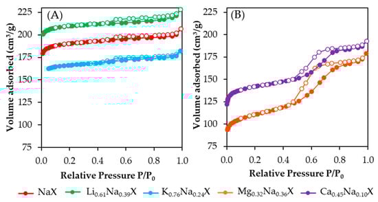 Figure 2 presents nitrogen adsorption-desorption isotherms of cation exchanged samples. One can observe significant differences between the shape of the isotherms obtained for zeolites containing monovalent and divalent cations. The isotherms of zeolite samples comprised of alkali metals (Li, Na, K) are combination of types Ib and IVa according to the IUPAC classification. For low relative pressure the N2 adsorption increased very fast with the increase of P/P0, which is characteristic for microporous materials. In addition, the isotherms exhibited hysteresis loop for P/P0 > 0.4, which indicated the presence of mesopores. Axes in both Figure 2A,B were set with the same range of values for better visualization of shape differences.