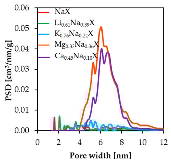 Based on N2 adsorption-desorption isotherms measurements at 77 K, the pore size distributions were determined. The PSD results of the studied samples were estimated by applying the DFT theory and are presented in Figure 3. Mesopore volume presented in Table 2 was calculated by subtracting values of cumulative pore volume at 2 nm from volume at 12 nm; therefore, Vmeso indicates volume of mesopores in specific range of pore width. The samples, which contain small cations, such as lithium and sodium, do not exhibit significant amount of mesopore volume, i.e., in the range 2–50 nm. These samples have the distinct peaks in the range of 2 nm, which is associated with the presence of micropores fraction.