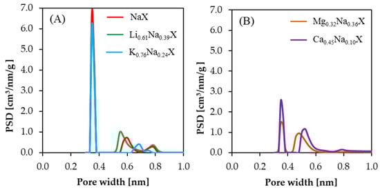 Pore size distributions of samples containing the monovalent (A) and divalent cations (B), calculated from CO2 isotherms at 273 K.