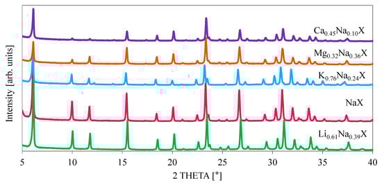 The crystallinity of the zeolite samples, before and after cation exchange treatment, was examined by X-ray diffraction. The diffractograms of investigated samples are illustrated in Figure 5 and Figure 6. It can be observed that all the modified samples exhibit the typical peak patterns of the faujasite (FAU) structure [,], which is characteristic for the zeolite X and Y. However, the intensities of the diffraction peaks for K0.76Na0.24X, Mg0.32Na0.36X and Ca0.45Na0.10X samples were significantly reduced. For all diffractograms the zeolite X phase was attributed to pattern 00-038-0237.