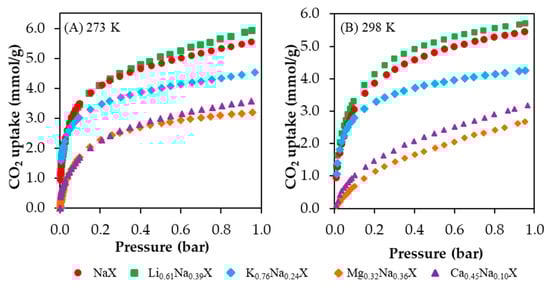 Moreover, sorbent materials might be characterized in terms of normalized CO2 uptake, which in our case was obtained by dividing the CO2 uptake at 273 K by SBET. The following values were obtained: 9.52 × 10−3 mmol/m2 for Li0.61Na0.39X, 9.75 × 10−3 mmol/m2 for NaX, 9.15 × 10−3 mmol/m2 for K0.76Na0.24X, 9.33 × 10−3 mmol/m2 for Mg0.32Na0.36X and 8.33 × 10−3 mmol/m2 for Ca0.45Na0.10X. These values might provide useful information, mostly about the influence of the surface chemistry or some additional interactions. As can be seen, sample NaX has the highest normalized adsorption capacity, and for sample Li0.61Na0.39X, this value is slightly lower. Interestingly, it might be concluded that the higher the amount of sodium in the zeolite is, the higher the normalized adsorption capacity is.