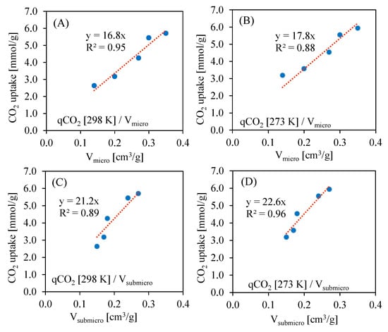 Figure 8 presents the correlations of CO2 uptake vs. micropore or submicropore volumes at 273 K and 298 K. As the CO2 uptake is negligible for non-porous materials, the linear equation has only one parameter, i.e., slope. In all cases, the R2 parameter is above 0.9, which may indicate a high impact of the pore volume on the CO2 uptake. One should notice that in case of submicropores, the slope has a higher value compared to impact. This indicates that submicropores are crucial for CO2 sorption, which is supported by other studies [,,].
