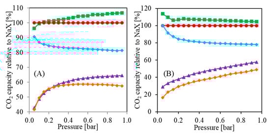 Figure 9 presents CO2 capacities relative to NaX form vs. pressure obtained based on the results from Figure 7. One can notice that the ion exchange differently affects the CO2 capacity dependence on CO2 pressure. In Figure 9A, the Ca0.45Na0.10X and Mg0.32Na0.36X are about 60% less effective at a pressure of 0.05 bar compared to NaX. At a pressure of about 0.3 bar, the difference is smaller, i.e., about 40%. Worth noting is that at a higher pressure, the Ca0.45Na0.10X form is more effective than Mg0.32Na0.36X. Interestingly, the Li0.61Na0.39X form is more effective at higher pressures, and it can be expected that even higher pressures will result in better performance compared to NaX.