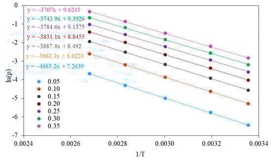 The isosteric heat of adsorption was estimated using the Sips equation combined with the Clausius–Clapeyron equation. The isosteric heats of adsorption were determined by evaluating the slope of the plot ln(p) versus 1/T at a constant coverage in the range of 0.05–0.35 (Figure 11 and Figure 12).