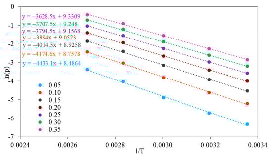 In this study, the nonlinear sum of the squares of the errors method was used to fit the experimental data, Equation (6) []: