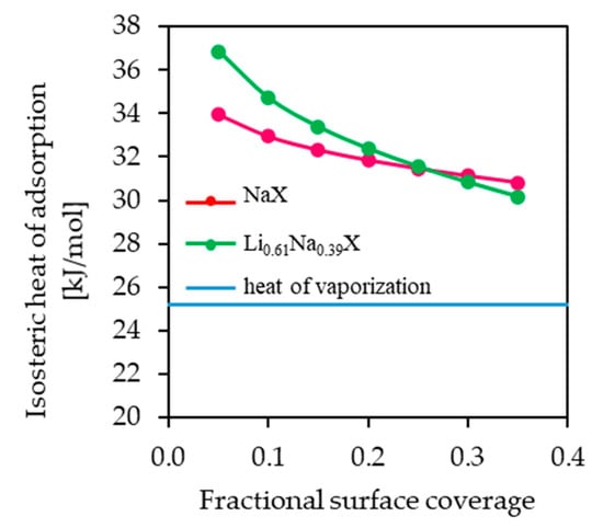 The values of isosteric heat of adsorption for fractional surface coverage of 0.05–0.35 are similar for NaX and Li0.61Na0.39X (31–37 kJ/mol) and are much higher than heat of vaporization at the boiling point of CO2 (Figure 13). The values of isosteric heat of adsorption indicated the physical nature of the adsorption mechanism.