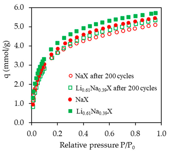 The stability of obtained sorbents in multiple sorption/desorption aging cycles has been measured. The Li0.61Na0.39X sorbent exhibited very high stability during such measurements, which is crucial for application in industrial processes. An approximate 5% decrease of CO2 uptake was observed after 200 sorption/desorption cycles. As textural parameters do not change during the stability test, the changes in the surface chemistry, such as the formation of carbonates, must be responsible for observed decrease.