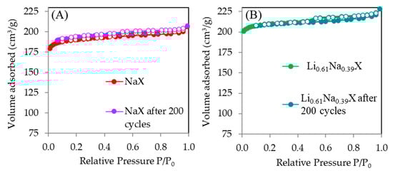 N2 adsorption/desorption isotherms of particular zeolites before and after aging tests: (A) NaX, (B) Li0.61Na0.39X.