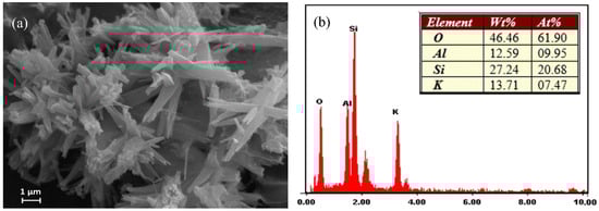 The morphology of the synthetic merlinoite was examined by SEM. Figure 3 shows the SEM photos at 5000× magnification. The morphology was characterized by bundles of columns with uneven lengths. EDS was used to analyze the synthetic merlinoite’s elemental components. The constituent elements are shown by weight percent in Figure 3b. The results indicate that the merlinoite consists mainly of silicon, aluminum, potassium, and oxygen.