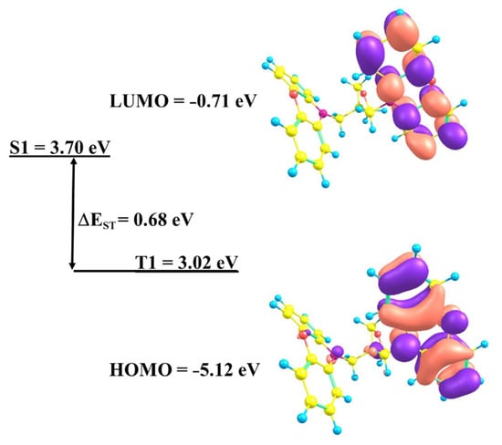 In order to better understand the link between photophysical and electronic characteristics of the synthesized host material BPMO, the theoretical calculation was carried out based on Gaussian software, density functional theory (DFT). Figure 1 shows the electron density distributions of the frontier molecular orbitals. The molecular structure is distributed by the highest occupied molecular orbitals (HOMO) and the lowest unoccupied molecular orbitals (LUMO). For BPMO, the HOMO/LUMO values estimated are −5.1/−0.7 eV, while the singlet and triplet energy are 3.7 and 3.0 eV, respectively (Table 1). Therefore, the BPMO host has 0.68 eV singlet-triplet splitting energy.