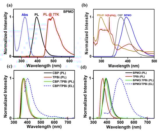 Furthermore, Figure 2c,d shows a more significant redshift between the PL and EL spectra for host BPMO than CBP. The shifting is observed between the individual (BPMO/CBP and TPBi) and mixture (BPMO/CBP:TPBi) of the host and electron-transporting layer (ETL). A comparative redshift suggests the possibility of exciplex formation between the host BPMO and ETL TPBi (See details Section 3.2)