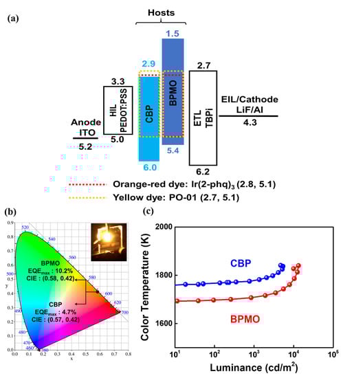 BPMO- and CBP-based candlelight organic LED showing (a) schematic energy level diagram using emitters PO-01 (yellow) and Ir(2-phq)3 (orange-red), (b) CIE chromaticity with achieved maximum EQE and device pixel image (inset figure), and (c) color-temperature variation with luminance.