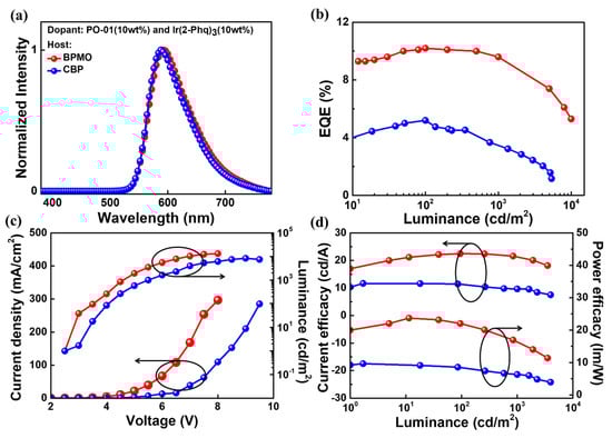Figure 5c shows the current-density curves concerning voltages. The BPMO-based device possesses higher current density and luminance than the CBP-based device, indicative of the high carrier mobility of BPMO. Such devices may show a better injection of positive charge carriers and efficient exciton generation in the emissive zone [44,45]. However, increasing the voltage increases the current density and luminance decreases due to charge imbalance and the influence of exciton quenching [46].
