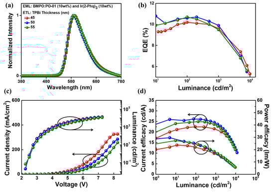 For achieving higher efficiency, the device is optimized by varying the thickness of the electron-transport layer (ETL). The EL properties of studied organic LED devices are shown in Figure 6, and the values are summarized in Table 3. Figure 6 shows the studied BPMO- and CBP-based candlelight organic LEDs with (at 10 wt%) yellow and (at 10 wt%) orange-red emitter by varying electron transporting layer (ETL) thickness. Negligible change is observed in EL spectra on varying thickness from 45–55 nm (Figure 6a). Figure 6b displays that EQE increases on increasing the thickness, which may be attributed to microcavity changes in the fabricated organic LED device.