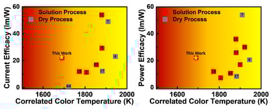 The reported color temperature (at 100 cd/m2) for the solution and dry-processed candlelight organic LED devices against current efficacy and power efficacy [2,4,5,7,11,12,17,18,21,64,65].