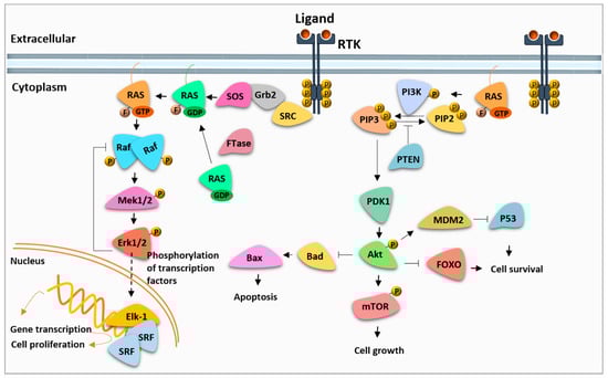 RAS engages with two major downstream effector signaling pathways, including Raf/MEK/Erk (MAPK) and phosphatidylinositol-3-kinase (PI3K) cascades. These pathways are associated with specific cancer-related phenotypes, including transcriptional reprogramming, promoted cell survival and proliferation, suppressed apoptosis and enhanced invasiveness of the cells [23]. Mitogenic signals from upstream growth factor receptors are transmitted into cells by RAS proteins. RAS proteins attach to the plasma membrane with a process facilitated by several post-translational modifications. A farnesyl isoprenoid moiety is added to RAS by farnesyltransferase (FTs) to increase its hydrophobicity and enable its association with the plasma membrane [24]. Membrane-anchored RAS is activated by GTP loading and serves as an activator for effector kinases by recruiting them to the cell membrane, where further phosphorylation events enable their subsequent activation [25]. GTP-loaded RAS proteins can activate both PI3K/Akt/mTOR and Raf/MEK/Erk signaling cascades, which are compelling therapeutic targets as major mediators of RAS-induced oncogenic signal transduction (Figure 1).