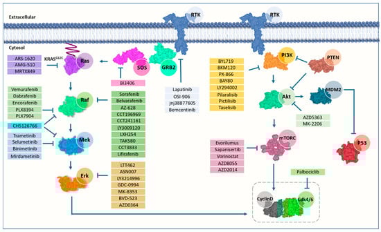 Aberrations in the PI3K-Akt signaling pathway have been implicated with tumorigenesis and resistance to anti-cancer therapies. Dysregulation of the PI3K signaling can occur through different mechanisms with a subset of mutations in the axis. These alterations include amplification of RTKs (EGFR and HER2), mutations in PI3K subunits (p110a, and p85a, encoded by PIK3CA and PIK3R1, respectively), loss/mutation of the phosphatase tensin homolog (PTEN), Akt overexpression or RAS hyperactivation. Singly targeting RAS-induced overactivation of PI3K-Akt signaling remains challenging due to the intrinsic resistance caused by beta catenin [149] and p90 ribosomal S6 kinase (RSK) activation [150,151], the latter as a family of Erk substrate members. Thus, inhibitors of the components of PI3K-Akt signaling have been generally combined with different agents to exert a potent anti-cancer effect.