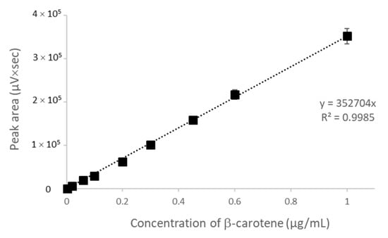 Calibration curve for β-carotene determination by HPLC using a C18 column.