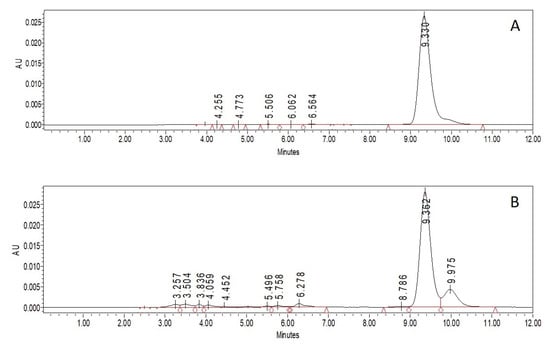 Chromatograms of pure CAR (A) and CAR extracted from CAR/HP-CD aggregates (B). CAR/HP-CD aggregates were prepared using 5% HP-CD in water, and CAR was dissolved in acetone.