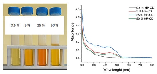 Finally, the effect of HP-CD concentration on the formation of CAR/HP-CD aggregates was investigated. The highest amount of entrapped CAR was found using 25% aqueous dispersion of HP-CD (Table 3). The obtained dispersions of CAR/HP-CD aggregates and their spectra are presented in Figure 3. As seen, the use of 25% HP-CD resulted in the highest color intensity of CAR/HP-CD aggregate dispersions. The content of entrapped CAR decreases in the presence of 50% HP-CD. At present, it is well known that CD can spontaneously self-assemble in water solutions and form visible and subvisible aggregates. How and why CD aggregates is not fully clear. The phenomena of CD aggregation and the reliable methods for the analysis of aggregates are under investigation [34,35]. The aggregation of CD is a concentration-dependent process. The critical aggregation concentration value of 2-hydroxypropyl-β-cyclodextrin in water solution cM ≈ 118 mg/mL [36]. Moreover, using molecular-dynamic calculations, Bikadi et al. demonstrated that the aggregation of CD is significant for their complexation behavior [37]. Therefore, the dependence of entrapped CAR content on the concentration of HP-CD can be also related to HP-CD behavior in water and the tendency for self-assembly.