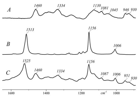 The interaction of CAR with HP-CD was shown by Raman spectroscopy (Figure 4). Three bands of the pure CAR seen at 1513, 1156, and 1006 cm−1 are attributed to C=C, C-C stretching vibrations, and CH rocking vibrations of CH3 groups attached to the polyene chain coupled with C-C bonds [38]. The stretching modes of HP-CD produce relatively weak Raman signals. The region between 1200 and 1600 cm−1 contains the bands related to CH, CH2, and COH deformation. The characteristic bands of CO stretching, C-C stretching and COC deformation modes, referring to the glycosidic bond are in the region between 1200 and 900 cm−1 [39]. The Raman spectrum of the CAR/HP-CD aggregate exhibits the complete spectroscopic vibrational pattern of the included non-polar guest except that the ν1 band is shifted from 1513 cm−1 to the higher wavenumbers 1525 cm−1. Due to the conformational changes induced by the CAR/HP-CD aggregate formation, an electronic conjugation degree decreases in the polyene chain [21]. Two other typical bands of β-carotene at 1156 and 1006 cm−1 were at the same positions after the CAR entrapping by the HP-CD [40]. In the Raman spectrum of the CAR/HP-CD aggregate, some bands related to the glycosidic bonds of HP-CD changed. Namely, the band at 946 cm−1 related to the symmetrical C-O-C stretching of pure HP-CD shifted to 951 cm−1, and the band at 1081 cm−1 attributed to C-O stretching of glycosidic bond shifted to 1087 cm−1 [41].