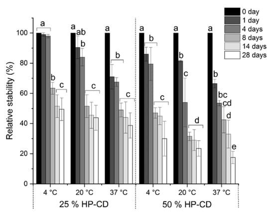 Relative stability of CAR in the CAR/HP-CD aggregates obtained using 25 and 50% HP-CD aqueous dispersions under the storage in the dark at different temperatures. Different letters indicate significant differences (p < 0.05) of CAR stability within each group of stability data.