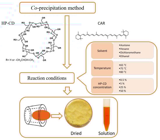 The procedure for the preparation of CAR/HP-CD aggregates by the co-precipitation method was optimized. The best conditions were found to be as follows: 25% concentration of 2-hydroxypropyl-β-cyclodextrin in water, 65 °C temperature, and acetone for β-carotene dissolution. The efficiency of entrapping was equal to 88%. CAR entrapped in the CAR/HP-CD aggregates prepared using 25% concentration of 2-hydroxypropyl-β-cyclodextrin in water exhibited higher stability compared to the ones prepared at 50% concentration of 2-hydroxypropyl-β-cyclodextrin in water.